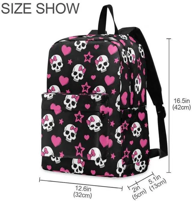 MNSRUU Student Backpack for School Pink Hearts and Skulls Laptop Backpack Aesthetic School Bookbags Casual Daypack Backpack Fits 15.6 Inch Laptop