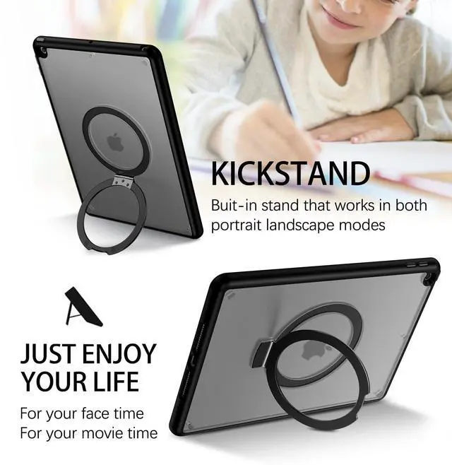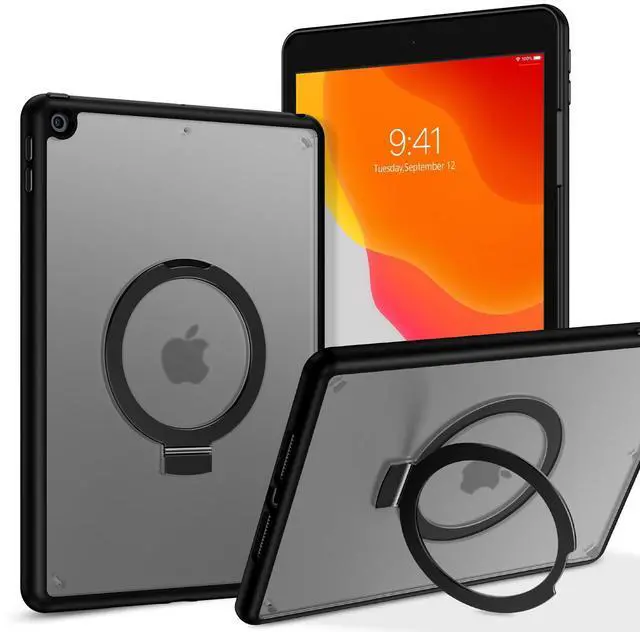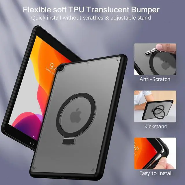 VENINGO iPad 9th Generation Case, iPad 8th Gen Case, iPad 7th Gen Case, iPad 10.2 Case, Foldable Kickstand Ring Translucent Matte Slim Thin Not Yellow Shockproof Protective Tablet Cover, Black