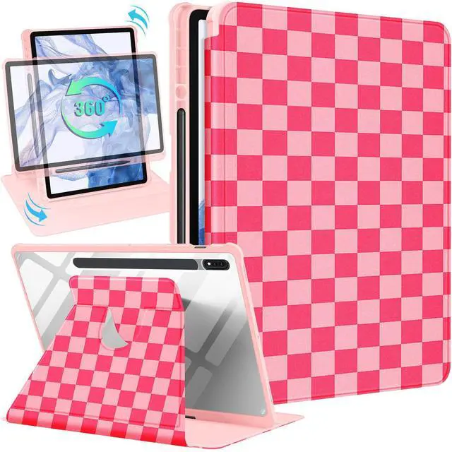 Wazzasoft for Samsung Galaxy Tab S7/S7 Plus/S8 Plus Case - 12.4 Inch Folio Cover Pencil Holder - Women/Girls Cute Girly Checkered Unique Design - Rotating Tablet Case