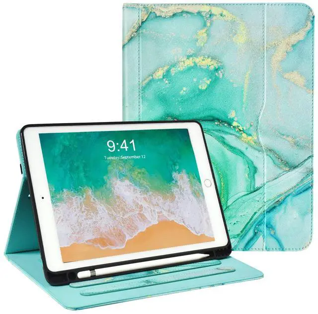 Zonefoker for iPad 6th 5th Generation Cases 2018/2017, iPad Air 2 Case 2014, iPad Air 2013, iPad Pro 9.7 inch Case 2016 with Pencil Holder, Leather Folio Cover for Kids, Women, Men, Marble Green