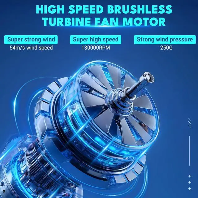 4-in-1 Compressed Air Duster & Vacuum This Violent turbo fan is equipped with proprietary accessories that can meet blowing and vacuuming tasks. It is an ideal choice for cleaning office desks, car interiors, and pet hair, as well as a dust collector for keyboards and other items. the unique LED light design makes cleaning dark corners easier and more convenient, Very suitable for daily cleaning and outdoor travel ^^ Powerful and Efficient This mini electric air dust is equipped with an 200W efficient dual turbo brushless motor with 4 wind speeds to choose from, ranging from 10% -30% -60% -100%max mode at 130, 000 RPMcan offer 50M/S wind speed and 250G blowing forcehighest gear, Long press the button.