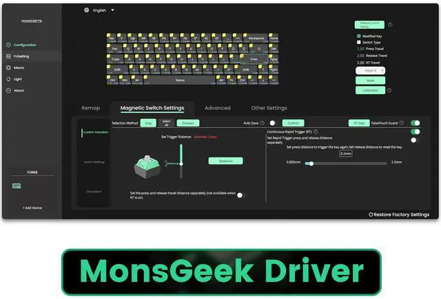 Compatible with Mainstream Magnetic Switches: FUN68 Series Rapid Trigger Keyboard offers cross-compatibility with 6 third-party magnetic switches. Users can select the corresponding switch from the list in the MonsGeek Driver and easily calibrate the keyboard after replacement. You can also mix and match them in different keys simultaneously