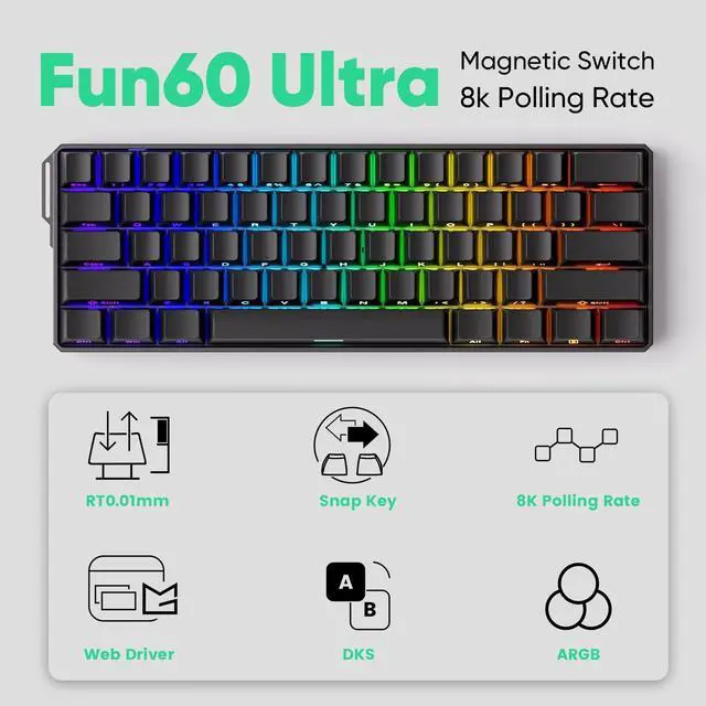 FUN60 Ultra's Functions: The FUN60 Ultra, packs a punch with its functions, like DKS, Toggle Key, Mod-Tap, etc. Additionally, with high precision TMR sensor, FUN60 HE keyboard offers an amazing customizable range from 0.1 mm to 3.3 mm in 0.01 mm precision step, suiting gamers seeking speed and precision ^^ Compatible with Mainstream