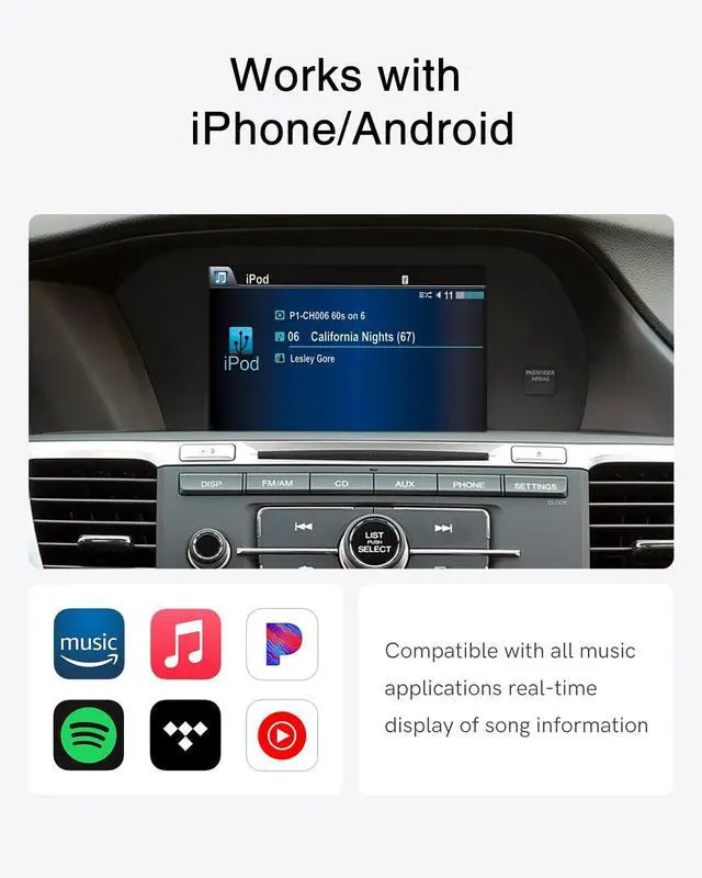 Screen: Works with iOS & Android to show artist and track info on your car's screen, letting you keep your eyes on the road instead of your phone. ^^ PLUG, PAIR and