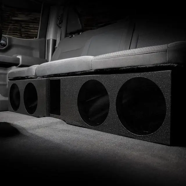 Ideal enclosure box fit with 4-hole 8-inch openings, allowing for 4 powerful subwoofer speakers, enhancing auditory bass and sound experience ^^ Compatible with 2007-2026 Chevy Silverado Crew Cab and GMC Sierra Crew Cab trucks ^^ Comes with an underseat down front fire capabilities, designed to enhance audio projection, that help produce a noticeably louder and crisper sound than ever before ^^ Designed with a rugged bed liner material, providing exceptional durability, reliable protection, and enhanced longevity for lasting stereo performance ^^ Crafted meticulously to create a space for loud, immersive bass playing, with a tuning frequency of 35 hertz, 0.8 cubic feet air space, and a mounting depth of 11.25 inches