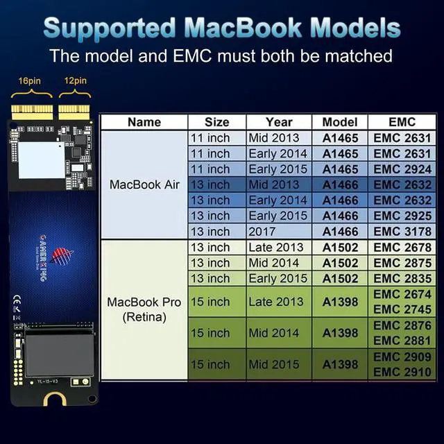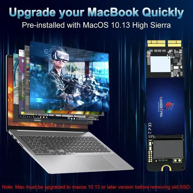 : 100% adaptable to the original interface, no need adapter. This Macbook Pro/Air SSD delivers a quick and affordable upgrade solution thats perfect for photo and video editing, gaming, and other heavy workloads applications. ^^ This MacBook Air replacement ssd fits for MacBook Air Mid 2013/Early 2014 A1465 emc 2631, Early 2015 A1465 emc 2924; Mid 2013/Early 2014 A1466 emc 2632, Early 2015 A1466 emc 2925, 2017 A1466 emc 3178; fits for MacBook Pro Late 2013 A1502 emc 2678, Mid 2014 A1502 emc 2875, Early 2015 A1502 emc 2835; Late 2013 A1398 emc 2674, 2745; Mid 2014 A1398 emc 2876, 2881; Mid 2015 A1398 emc 2909, 2910. ^^ This macbook ssd adopts NVMe PCIe Gen 3.0 x4 technology, read/write speed up to 2450MB/s / 1850MB/s, you can access and transfer files faster, delivers a performance boost to your workloads, so there's no limit to your creativity and productivity.