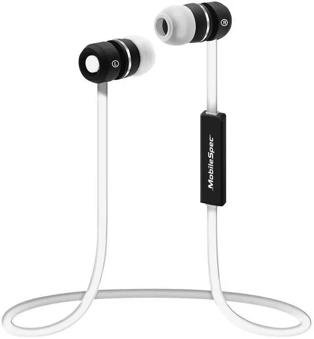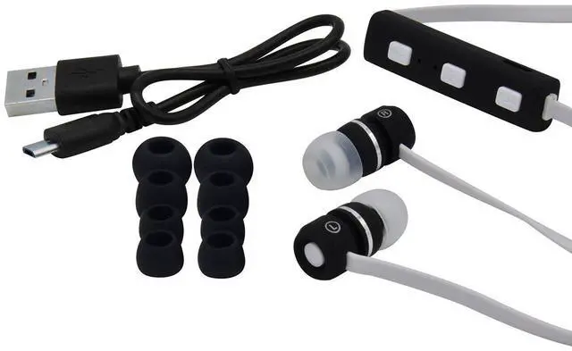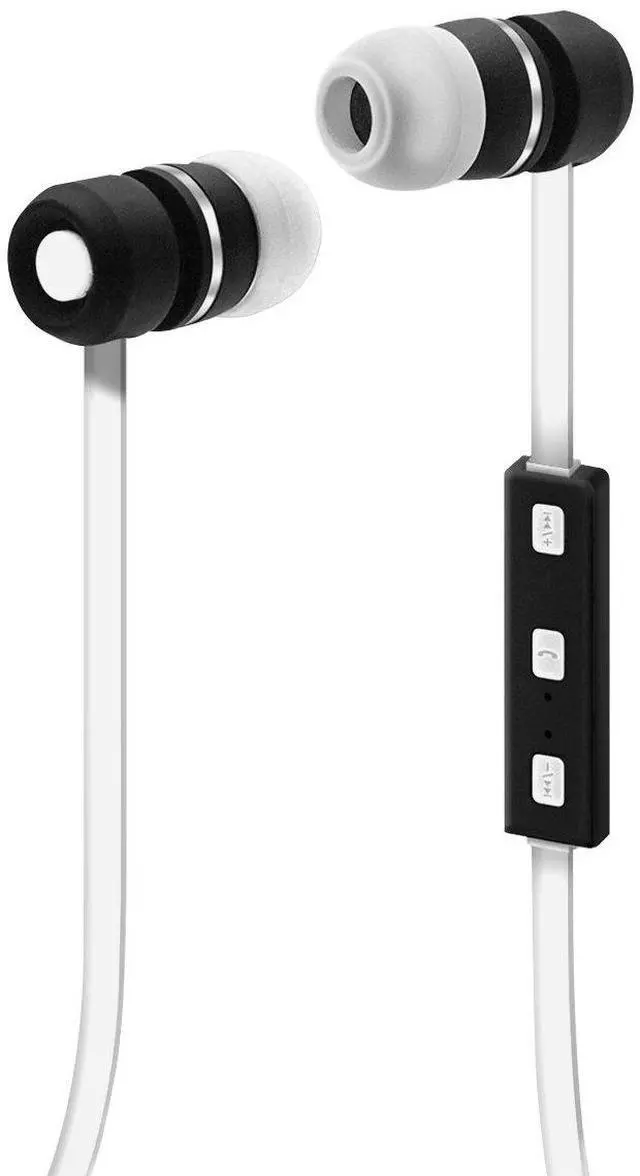 These white and black Bluetooth (R) headphones are quick and easy to pair with compatible devices. They feature volume control and a tangle free flat cord with an in-line microphone that allows a seamless switch between music and hands-free talking. They also includes extra ear tips and a charging cable.