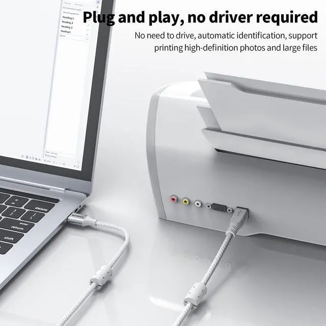 USB Printer CableMOSWAG USB Printer Cable is ideal for connecting usb b devices such as scanner, printer, server, camera such as HP, Canon, Lexmark, Epson, Dell, Xerox, Samsung and other usb b devices to a laptop, computer (Mac/PC) or other USB-enabled device. ^^ Super Fast TransferThis Printer Cable Up to 480 Mbps transfers data speed for USB 2.0 devices, print documents in seconds. Also this usb printer cable backwards compatible with USB 1.1 (12Mbps) and USB 1.0 ( 1.5M bps) standard devices. Plug and play, no need to install any drivers, convenient and fast.