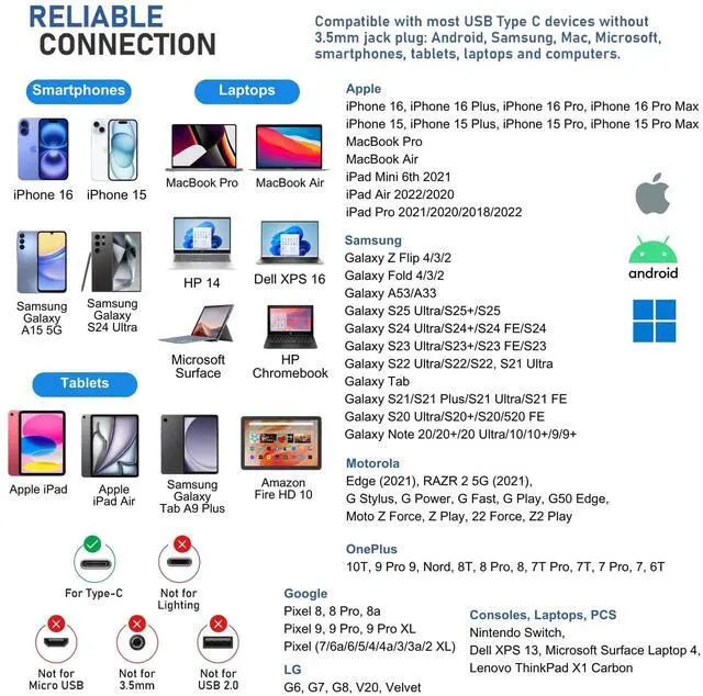 SAMSUNG: Galaxy S24/S23/S22/S21/S21+/S21 Ultra/S21/S21 Ultra/S21 FE/S20/ Galaxy Tab S8/S7/S6/S5e, A53/A54/A33/A34 - GOOGLE Pixel 7/6a/6 PRO/6/5/4/4a Edge 2021 LAPTOPS: DELL XPS 13, MICROSOFT Surface Laptop 4. And more devices without a 3.5mm jack port. We provide a 5-year warranty and our customer support is here to answer questions 24/7