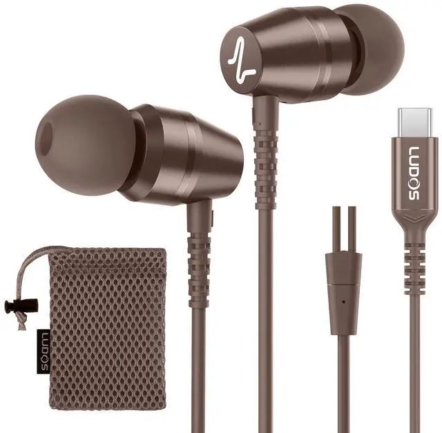 LUDOS OMNITONE USB C Headphones for iPhone 16 15 Pro Max Plus iPad Pro, 5 Years Warranty, USB-C Earbuds for Samsung Galaxy S24 S23 Ultra S22 S21 S20 A55 A54 A53, USB Type C Earphones - Brown