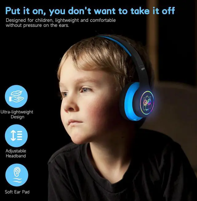[(Cool Lighting)] Our kids bluetooth headphones comes with RBG colorful LED lighting, can be freely double-click the button to control on and off, cool lighting can not only arouse kids curiosity, but also make the kids no longer lonely at night, bring unique music enjoyment to kids.