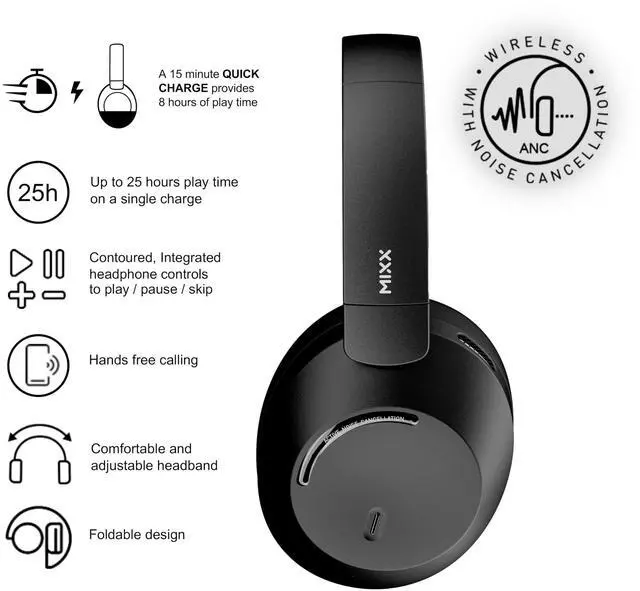 MIXX StreamQ C4 - Wireless Noise Cancelling Headphones with 40-Hour Battery Life and Transparent Mode - Foldable Over-Ear Design (Black)