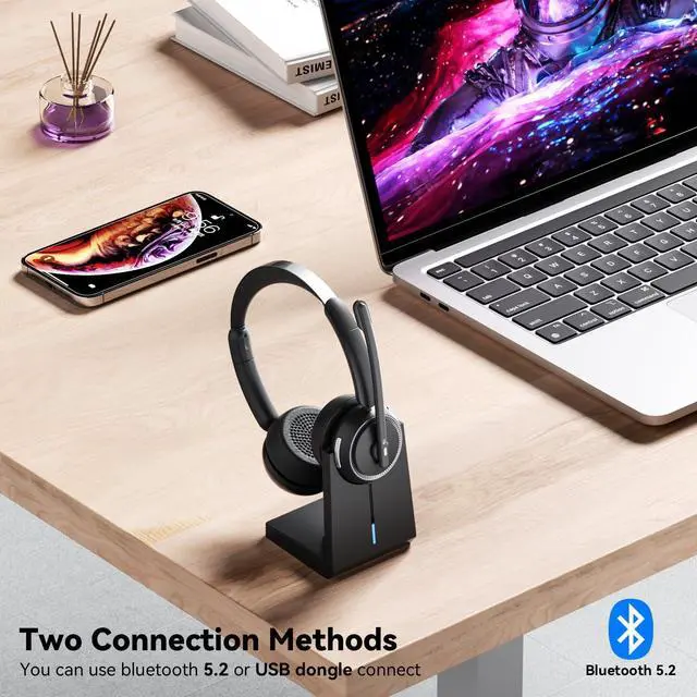 Noise Cancellation & Mute Function: This Bluetooth headset with microphone is equipped with advanced environmental noise cancellation (ENC) technology, making it perfect for use in call centers, homes, offices, or noisy work environments. The wireless headset with mic for work effectively filters out distractions like colleague chatter, keyboard typing, or children's noise at home. Simply press the mute button to maintain privacy during personal conversations with nearby colleagues or friends