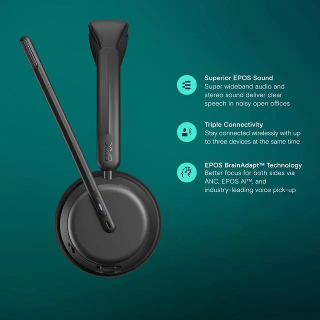 The EPOS IMPACT 1060T ANC is designed for professionals needing high-performance noise cancellation in open offices and remote work. Featuring hybrid adaptive ANC, this wireless headset with mic effectively blocks out background noise to help you stay focused. EPOS AI adaptive microphones ensure superior voice pickup, delivering crystal-clear calls on Microsoft Teams, Zoom, and Skype. With super wideband audio, this Bluetooth headset for work enhances natural speech clarity, making conversations more lifelike. Triple wireless connectivity lets you seamlessly switch between PC, laptop, smartphone, and tablet for uninterrupted workflows.