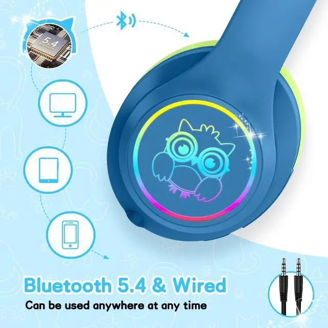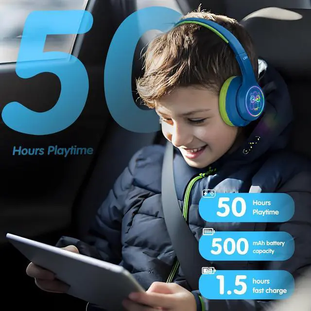 [(Cool Lighting)] Our kids bluetooth headphones comes with RBG colorful LED lighting, can be freely double-click the button to control on and off, cool lighting can not only arouse kids curiosity, but also make the kids no longer lonely at night, bring unique music enjoyment to kids.