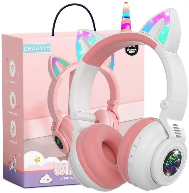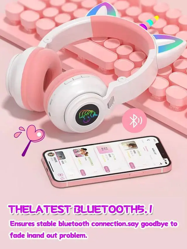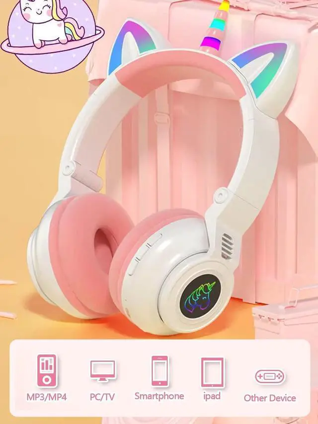 [(Unicorn Design with Flashing Lights)] These wireless headphones come with foldable unicorn - themed cat ears. The cat ear design features LED - lit elements along with a unicorn horn. The cat ears and antlers have inlaid red/blue/green LEDs that can flash and change color according to the rhythm. It's an ideal gift for toddlers, girls, boys, students, or cosplay enthusiasts.