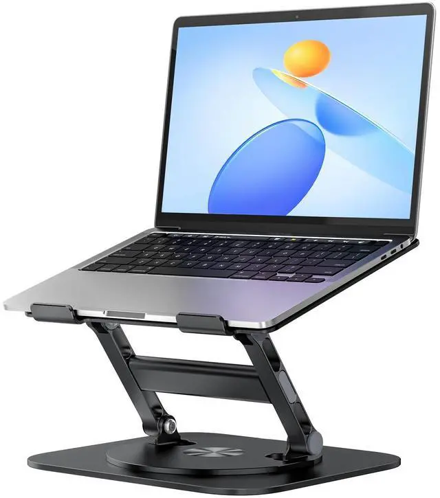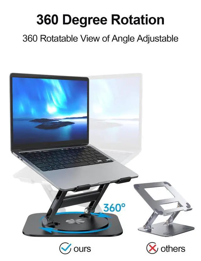 Ergonomic Adjustable Height: This foldable laptop stand could be adjustable in height and angle of your laptop, raising your laptop screen height flexibly from 1.18" to 21", for your better ergonomics to minimize neck fatigue, say goodbye to neck pains. ^^ StableThe office computer stand is made of high-quality thickened aluminum, and the larger turntable base can support 22 lbs (10kg) which are more stable and sturdier without worrying about any wobbling at all; The rubber on the holder hand is firmly stuck to protect your laptop from scratching and sliding off. ^^ Heat DissipationThe laptop riser rotary plate adopts an open hollow design which can enhance the air circulation to achieve the best heat dissipation effect, solve the concern of the weakened heat dissipation performance due to your long-playing use of computer. ^^ Broad CompatibilityThe laptop raised to stand compatible with MacBook Pro/Air, Dell, ASUS, Lenovo, Dell, HP, Microsoft, Toshiba, Samsung and all laptops 10 to 17.3 inches, whether working in home studies, office or conference room even on the messy desk, it is your best choice. Thank you for experiencing our innovative products.