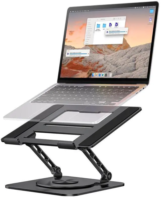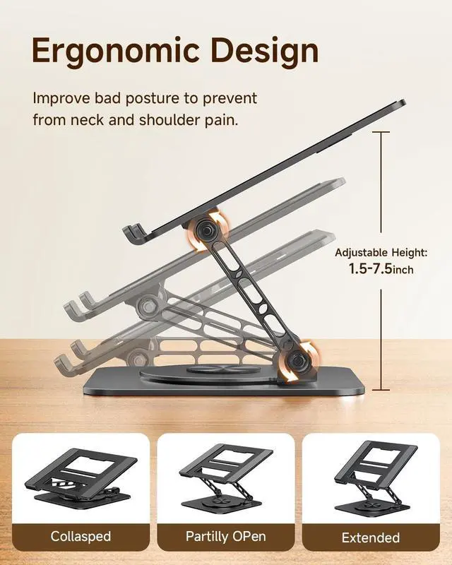 Ergonomic Adjustable Height: This foldable laptop stand could be adjustable in height and angle of your laptop, raising your laptop screen height flexibly from 1.18" to 21", for your better ergonomics to minimize neck fatigue, say goodbye to neck pains. ^^ StableThe office computer stand is made of high-quality thickened aluminum, and the larger turntable base can support 22 lbs (10kg) which are more stable and sturdier without worrying about any wobbling at all; The rubber on the holder hand is firmly stuck to protect your laptop from scratching and sliding off. ^^ Heat DissipationThe laptop riser rotary plate adopts an open hollow design which can enhance the air circulation to achieve the best heat dissipation effect, solve the concern of the weakened heat dissipation performance due to your long-playing use of computer. ^^ Broad CompatibilityThe laptop raised to stand compatible with MacBook Pro/Air, Dell, ASUS, Lenovo, Dell, HP, Microsoft, Toshiba, Samsung and all laptops 10 to 15 inches, whether working in home studies, office or conference room even on the messy desk, it is your best choice. Thank you for experiencing our innovative products.