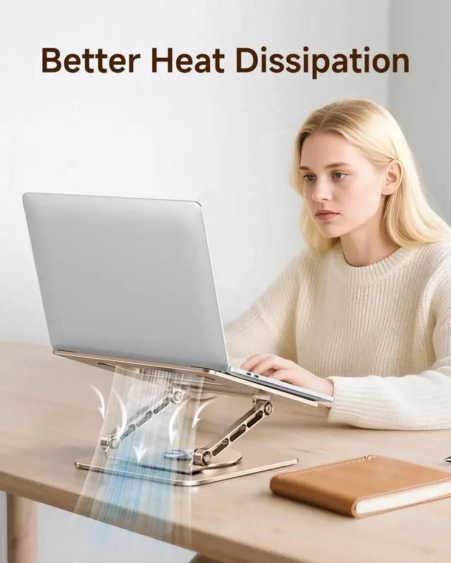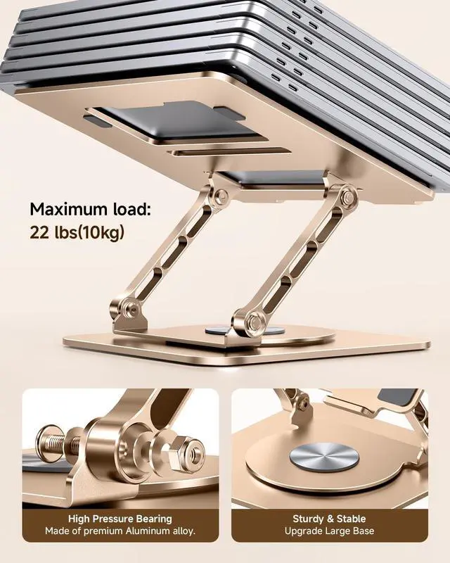 Ergonomic Adjustable Height: This foldable laptop stand could be adjustable in height and angle of your laptop, raising your laptop screen height flexibly from 1.18" to 21", for your better ergonomics to minimize neck fatigue, say goodbye to neck pains. ^^ StableThe office computer stand is made of high-quality thickened aluminum, and the larger turntable base can support 22 lbs (10kg) which are more stable and sturdier without worrying about any wobbling at all; The rubber on the holder hand is firmly stuck to protect your laptop from scratching and sliding off. ^^ Heat DissipationThe laptop riser rotary plate adopts an open hollow design which can enhance the air circulation to achieve the best heat dissipation effect, solve the concern of the weakened heat dissipation performance due to your long-playing use of computer. ^^ Broad CompatibilityThe laptop raised to stand compatible with MacBook Pro/Air, Dell, ASUS, Lenovo, Dell, HP, Microsoft, Toshiba, Samsung and all laptops 10 to 15 inches, whether working in home studies, office or conference room even on the messy desk, it is your best choice. Thank you for experiencing our innovative products.