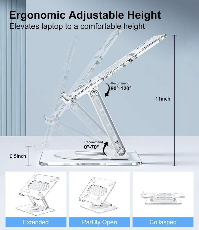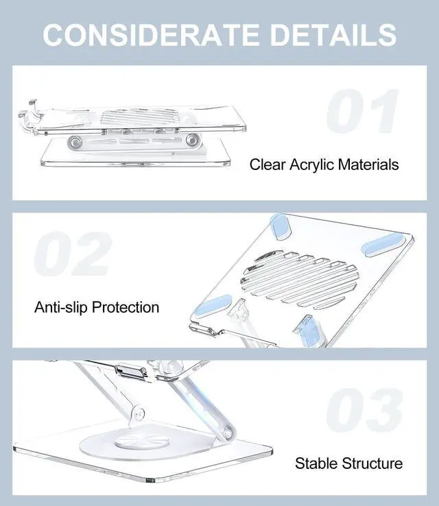 Elegant and Stylish DesignMCHOSE acrylic laptop stand is made of transparent premium Class-A acrylic material. Its sturdy structure ensures the durability and security from breakage, support up to 8.8 lbs (4kg), no worry any wobble at all; the rubber on the holder hands sticks tightly, ensure your laptop stable on the stand and prevent any scratches. ^^ 360 Degree RotationThis clear laptop stand can rotates on its centered round base, allowing the top half of the stand to rotate infinitely in either direction. This give you plenty of flexibility in terms of working position.