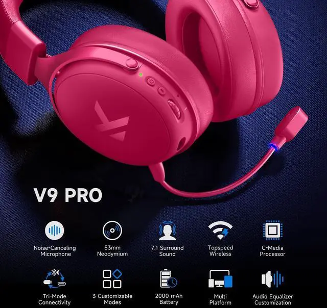 MCHOSE V9 serious Over Ear Headphones ensure crystal-clear communication for an optimal gaming experience ^^ Up to 250 Hours PlaytimeEnjoy marathon gaming sessions with an exceptional 250-hour battery life by our PC headset with mic, setting a new standard for wireless freedom and endurance in gaming headsets ^^ Designed for ComfortOur wireless gaming headphones features soft, breathable ear cushions, a 9-level adjustable and rotatable headband, and an ultra-lightweight build at just 0.60 lbsperfect for long gaming sessions ^^ Tri-Mode Connectivity for Multi-PlatformOur ps5 headset wireless supports 2.4GH z wireless, BT wireless, and wired connections.
