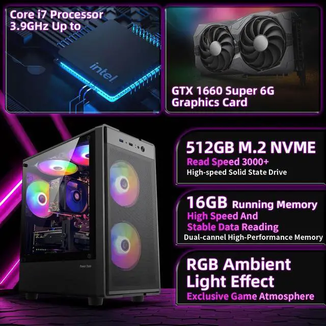 Tower Gaming PC Desktop: The Gaming PC comes With 2xUSB 3.06 x US8 2.01 x RJ-451xWi-Fi ^^AMD Radcon GTX1660 Super 6GB GDDR6 Video Card ^^ 1x HDMl ^^ 1x DisplayPort! 1x DVl ^^ This i7 Prebuilt gaming PC comes with accessories and technical support: This Tower gaming PC is equipped with RGB chassis lighting ^^ RGB fans x4, ^^ gaming keyboard x1 ^^ gaming mouse x1 ^^ mouse pad x1, lifetime free technical staff