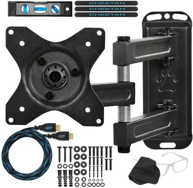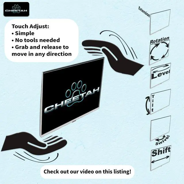 Cheetah Single Arm Mounts use our Exclusive Friction Ball for Smooth adjustment of extension, tilt, swivel, and rotation. Simply grab Display frame, adjust as desired and let go. No tools Required. ^^ Touch Adjust smooth movement is ideal for TVs/Monitors 30lbs or less. For heavier TVs, the Cheetah ALAMLB uses a larger friction ball with smooth movement for TVs up to 50lbs. ^^ Fits all TVs 12-32", most 40-48", and some 49" but check that VESA pattern is 100 or less and weight without stand is 40lbs or less.