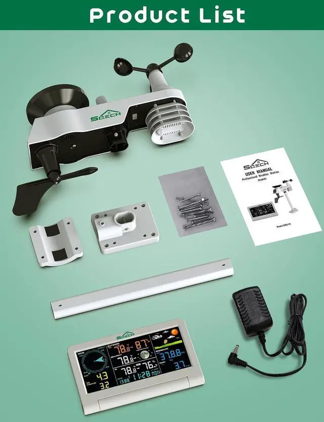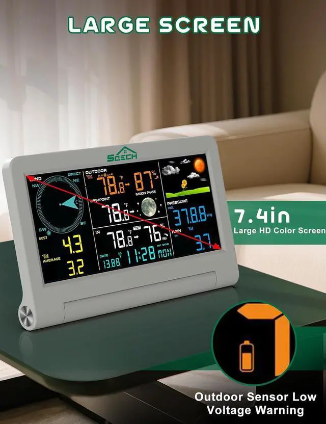 Multi-function Display ScreenThe 7.4-inch HD large color screen can display 12 types of information at the same time, including Wind Speed and Direction, Rainfall, Weather Forecast, Air Pressure, Time, Moon Phase, Indoor and Outdoor Temperature and Humidity, Feelslike Temperature, Dew Point Temperature and other information, and has 13 alarm settings to choose from. The console can be hung on the wall or placed on the desktop, with clear reading, simple and beautiful.