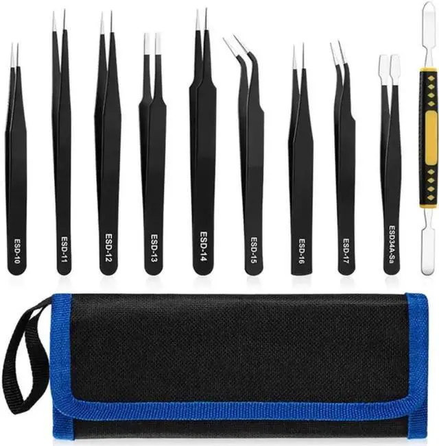 10 pieces of ESD tweezers set: The upgraded 10-in-1 ESD tweezers set has 9 different tweezers and a metal double-ended crowbar to meet your different needs. And all of them have passed strict quality tests.