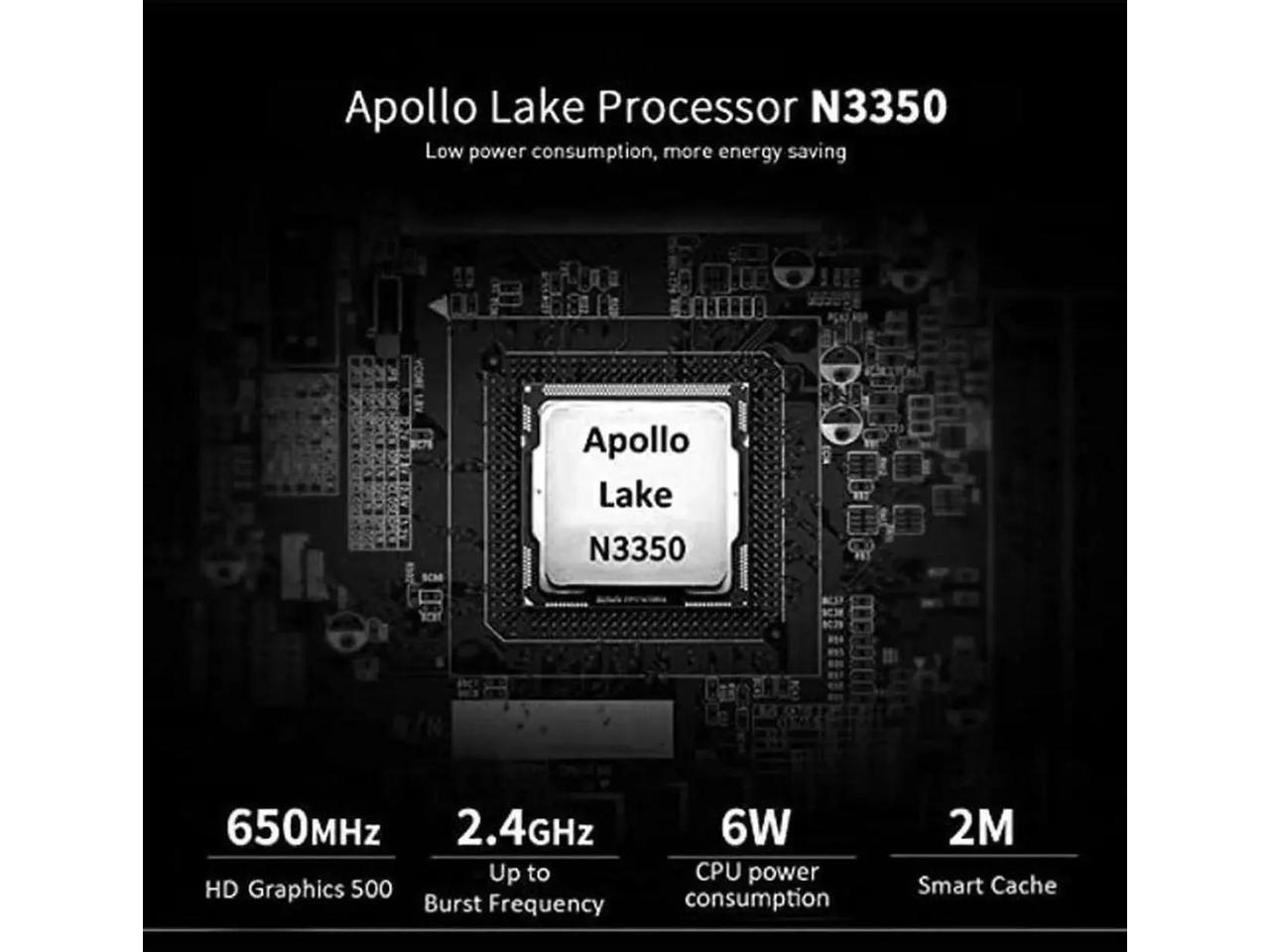 - [N3350 Processor] Equipped with Apollo Lake N3350 64-bit processor, 2M Cache, 1.10GHz base frequency, up to 2.4GHz, with HD Graphics 500, gives you higher efficiency, faster decoding data research and development.