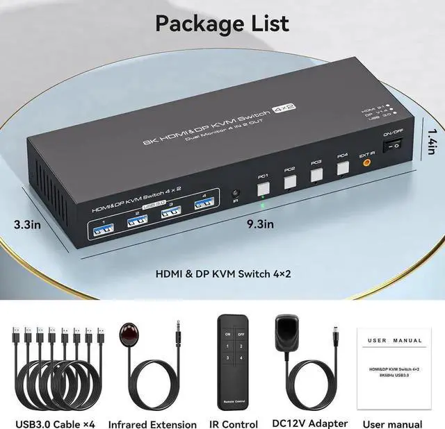 ![Main image of [Dual Monitor] Displayport HDMI KVM Switch 4 Computers 2 Monitors 8K@60Hz HDMI 2.1 + Displayport 1.4 USB 3.0 KVM Switch for 4 PC Sharing 2 Monitor and 4 USB 3.0 Devices with IR Remote Control](https://c1.neweggimages.com/productimage/nb640/C1DRS2509130HBK0OBE.jpg)