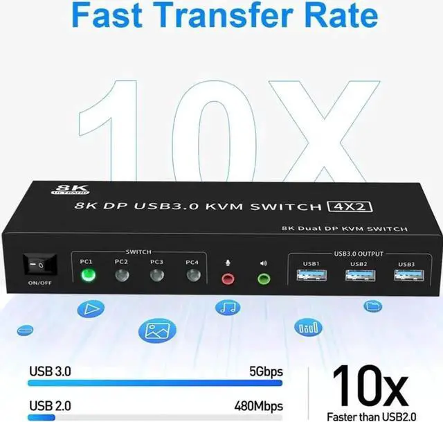 8K 60Hz 4x2 Displayport USB 3.0 KVM Switch allows you to share one USB keyboard, USB mouse, and two DP monitor to control 4 computers, laptops, game consoles.