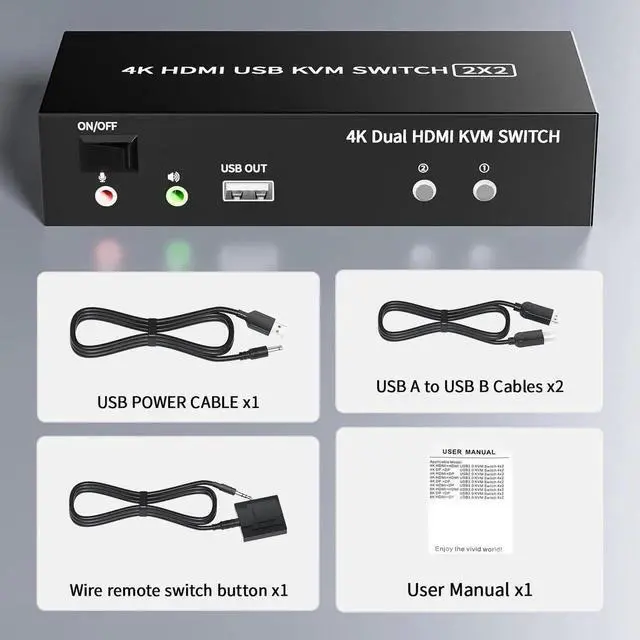 - The KVM switch does not feature EDID emulation, need to reset the displays and resolution after switching between 2 input signals