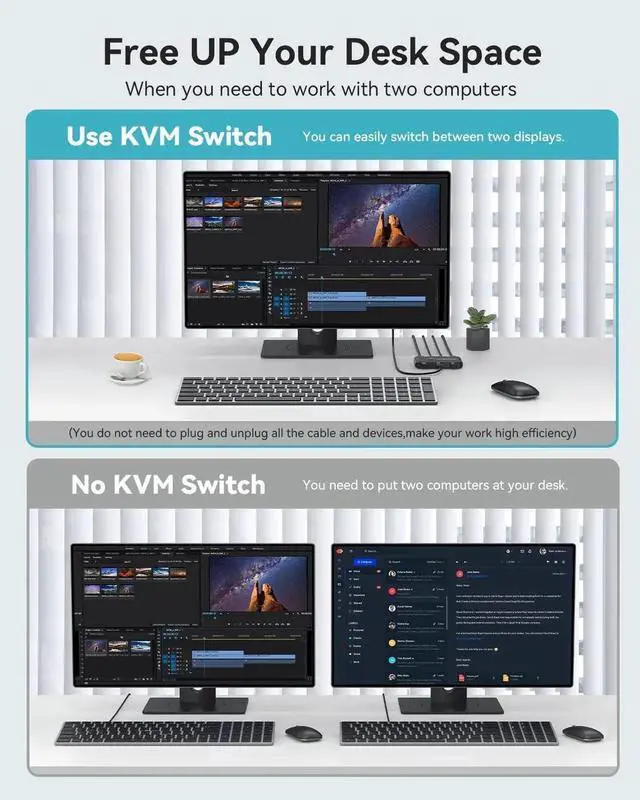 Our kvm switch save your desk space when you need to use two computers, you can easily switch between 2 computers and usb devices without all the clutter. No longer have to go thru the hassle of swinging the hdmi cable and usb cable back and forth anymore, improve your work efficiency greatly.