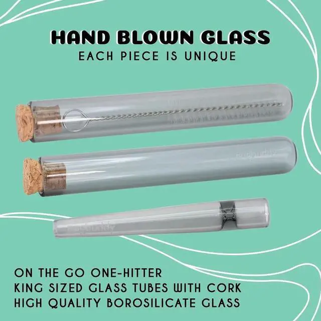 HAND-BLOWN BOROSILICATE: Each piece is hand blown and unique. Built to last - ditch the plastic and level up to glass tubes with cork lids.