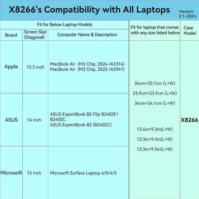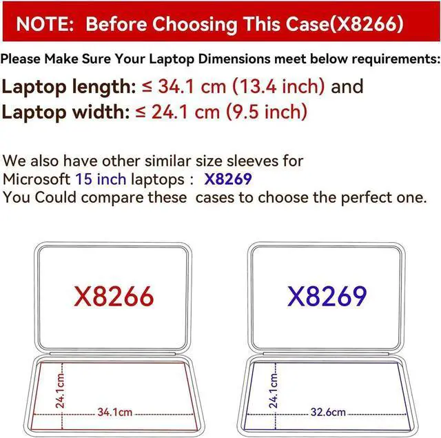 Model No.: X8266; internal dimensions of the case: 34.6x24.4x2.7 cm (13.6x9.6x1.1 inch) Recommend Laptop Size: 34.1 x 24.1 x 2.2 cm. Please confirm your laptop dimension. If the size of your laptop exceeds our recommended dimensions on any side, this sleeve will not fit your laptop