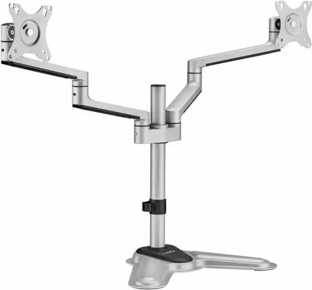 Crafted with a heavy-duty pole-mount freestanding design, this stand offers stability and durability while maintaining a sleek and stylish appearance in aluminum silver. Supporting VESA 75x75 & 100x100mm configurations, it provides effortless portrait and landscape orientation options to suit diverse viewing preferences. The built-in cable management system ensures a tidy workspace, while the detachable VESA plate design simplifies installation for a hassle-free setup. ThisErgoReach EP11 Premium Aluminum Dual-Screen Monitor Stand is backed by Rocstor's 5 year warranty and lifetime free technical support.