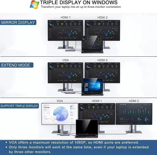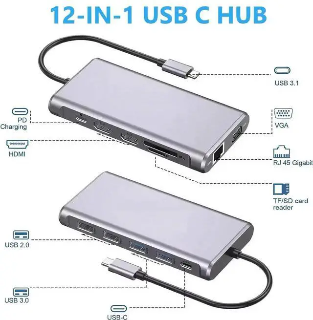 12-in-1 USB C Docking Station with Dual HDMI, 4K@60Hz, Gigabit Ethernet, 100W PD, USB 3.0 / 2.0, SD/TF Card Reader - for Laptops with Type C Port