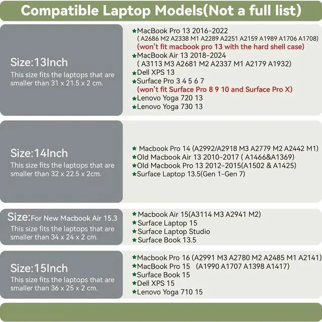 Perfect Size: Our laptop sleeve is compatible with New MacBook Air 13 2018-2024 ( A3113 M3 A2681 M2 A2337 M1 A2179 A1932),New MacBook Pro 13 2016-2022 (M2 M1 A2338 A2289 A2251 A2159 A1989 A1706 A1708)(wont fit macbook pro 13 with the hard shell case),Dell XPS 13, Surface Pro 7/Surface Pro 6/Surface Pro 5/Surface Pro 4/Surface Pro3(wont fit Surface Pro 8 and Surface Pro X), Lenovo Yoga 720 13,Lenovo Yoga 730 13.This size fits the laptops that are smaller than 31 x 21.5 x 2 cm