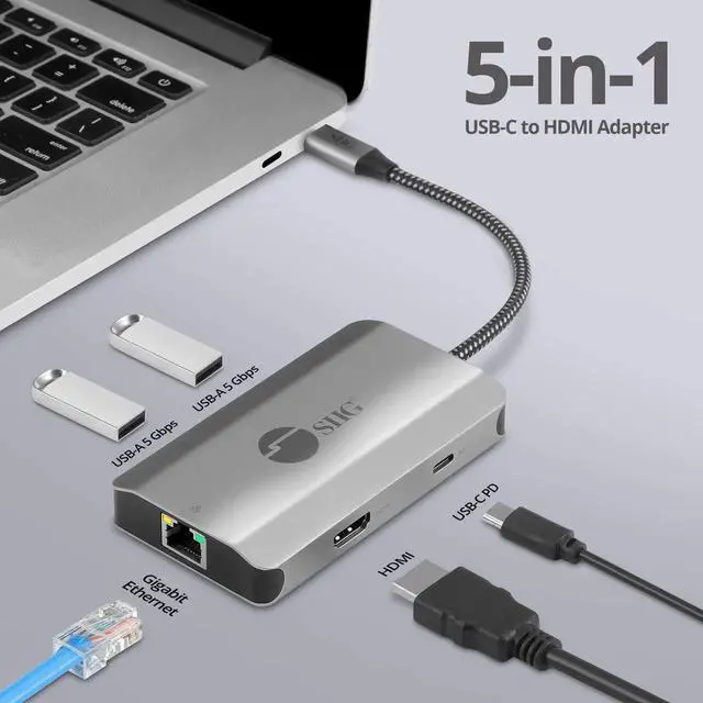 SIIG 5-in-1 USB C Hub, 4K 30Hz HDMI Output/Ethernet 1Gbps/ 2X USB-A 5Gbps/ PD 100W USB-C for MacBook, Windows(Intel/AMD/Snapdragon), Chromebooks and USB Devices (JU-H30L11-S1)