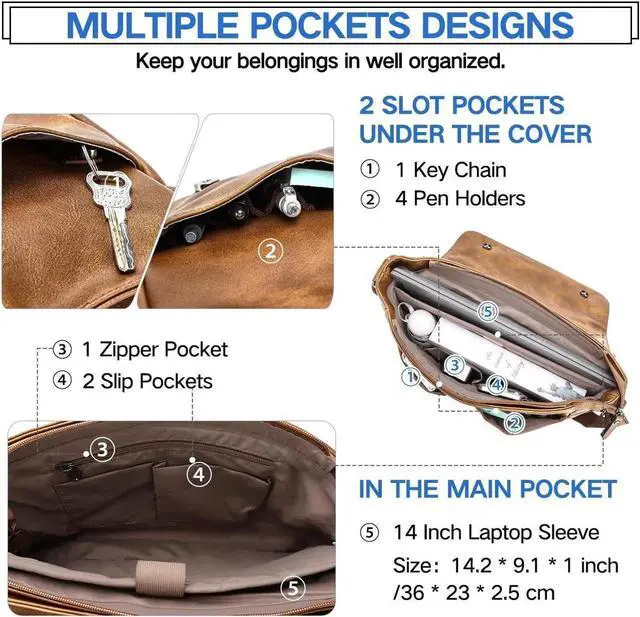 ORGANIZER & EASY ACCESSThe total 7 multifunctional pockets make your personal items neat and orderly. 1 phone pocket is in the front flap, 2 open pockets under the flap,1 inner zipper pocket,2 small open pockets,1 laptop pocket with velcro strap and 1back pocket. Your 14" laptop, wallet, umbrella,water bottle and magazine will all fit comfortably in the main compartment.