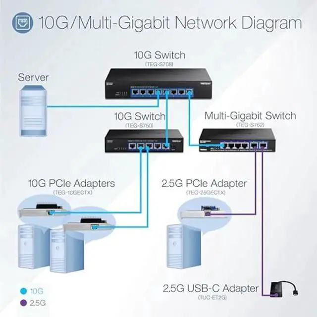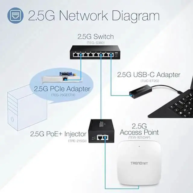TRENDnets USB-C 3.1 to 2.5GBASE -T Ethernet Adapter, model TUC-ET2G, is equipped with a 2.5GBASE -T RJ-45 port that provides higher gigabit speeds capable of up to 2.5G bps over existing Cat5e or better cabling. This USB-C to 2.5G Ethernet adapter features a USB-C 3.1 interface, and includes a USB-C to USB-A adapter that easily connects to either a USB enabled notebook or desktop computer for high-speed 2.5GBASE -T connectivity.