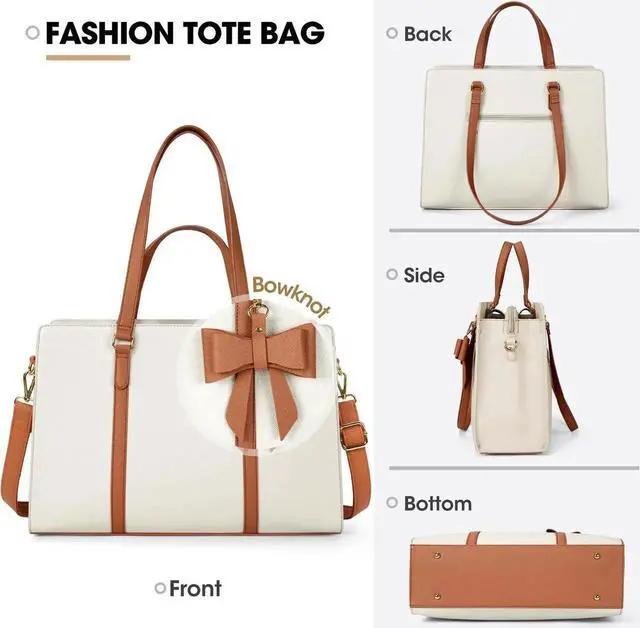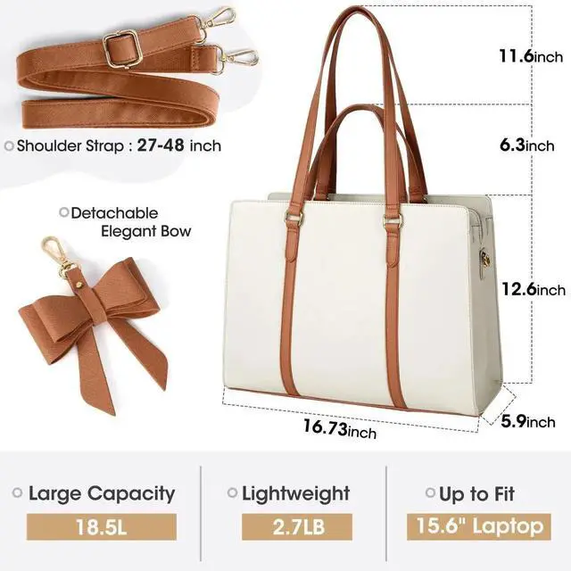 Perfect Size Work Tote BagThe size of the briefcase for women is 16.73"L x 5.9" W x 12.6" H; Net weight: 2.7 lb. Short handle drop 6.3" and long handle drop11.6", dual top handles design help you carry more comfortably. Adjustable and detachable shoulder strap is 27-48 inch long, provide you diverse carrying ways. It's a universal size so it fits for most 13"/14"/15"/15.6" laptops. Spacious and lightweight laptop bag for women, large enough to keep all your daily supplies well organized.