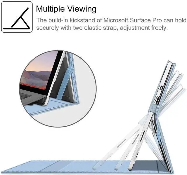 Unique design ensures Microsoft Surface Pro original built-in kickstand to be used at will for multi-viewing angles. Extra Pocket allows to store small items such as business card or usb charging cable if in need.