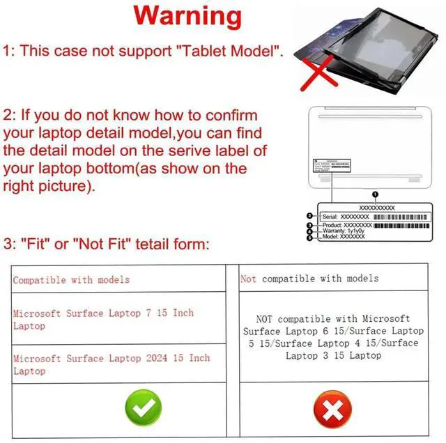 Warning: NOT compatible with Microsoft Surface Laptop 6 15/Surface Laptop 5 15/Surface Laptop 4 15/Surface Laptop 3 15 {{Warning:Most of returned because of choosing wrong model,please confrim your laptop model}}.