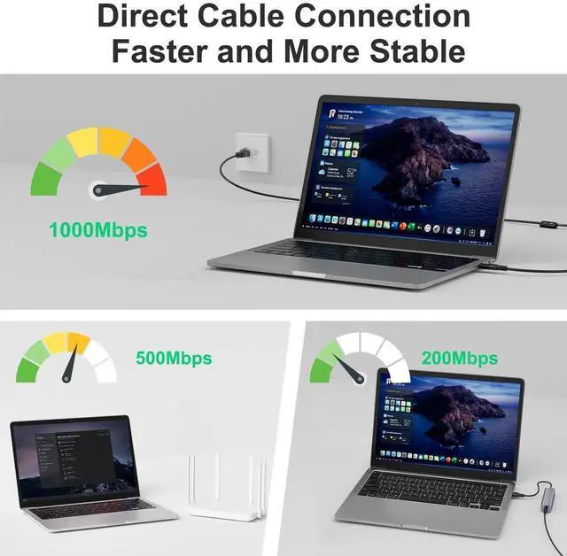 This USB C to ethernet cable is an important assistant for your business trips, office work, teaching, and gaming.