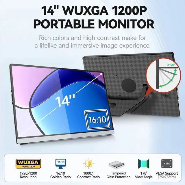 Intehill 14" Portable Monitor, WUXGA 1920x1200 Portable Screen with Full-Covered Tempered Glass, 16:10 USB-C HDMI External Display with Speakers & Stand, Travel Monitor Second Screen for Laptop, F14ZA