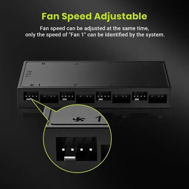 A SATA-powered 8-port PWM fan hub with ARGB sync capability for motherboard integration. Fan speed can be adjusted at the same time, but only the speed of "Fan 1" can be identified by the system.