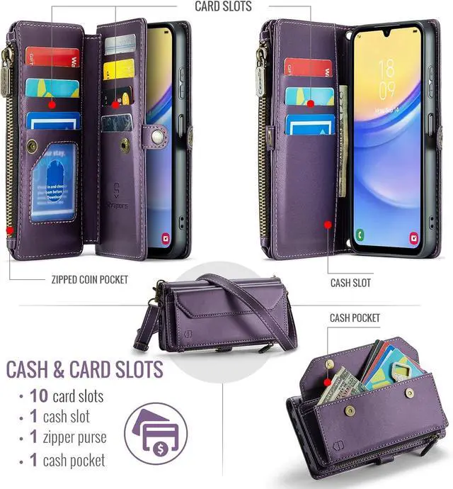 Multi-functional wallet case for Samsung A15 5G: This leather case for Galaxy A15 doubles as a wallet with 10 card slots, a zipped coin pocket and a cash pocket; You can keep your ID, credit cards, notes and coins all in one convenient place, effortlessly combining fashion and functionality