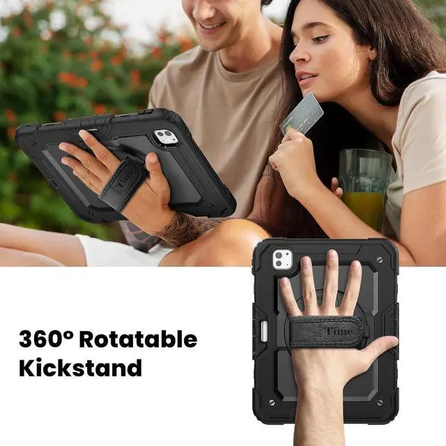 MULTI-ANGLE FUNCTIONALITY: 360° rotating stand with 5 positions for video calls, notes, or viewing; Detachable shoulder strap for commutes; Anti-slip hand strap secures during outdoor work; Dedicated pencil holder for hiking/transport